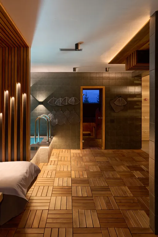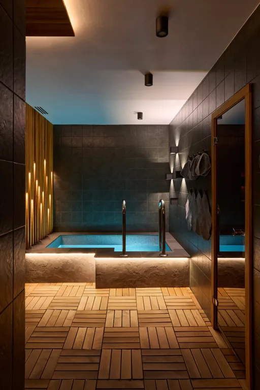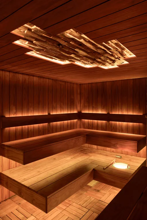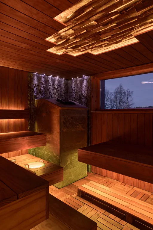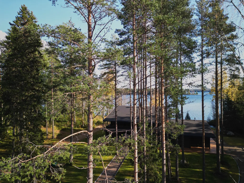 Банный комплекс в лесу на берегу озера.